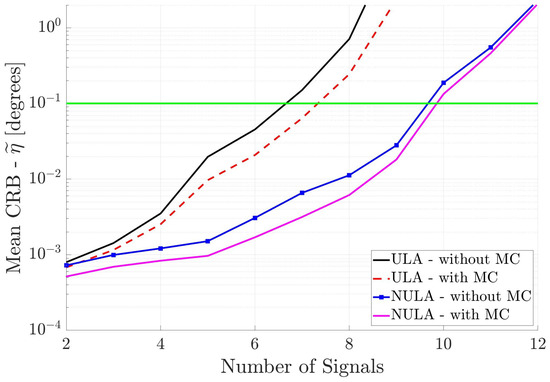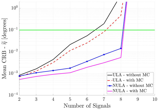 Figure 10 compares the mean CRB results for the linear arrays when the incident signals are known to be uncorrelated. Note that the horizontal axis in this figure is different than the previous figures. We find that the ULA results are largely unchanged, as the mean CRB curves for the ULA with and without MC crosses the threshold before eight incident signals are incident. The NULA has significantly lower mean CRB curves. The NULA with MC has slightly better performance than the NULA without MC, indicating that non-uniform spacing and mutual coupling help improve DOA estimation. Note that now one can estimate the directions of up to ten incident signals. Thus, even small aperture antenna arrays can operate in the underdetermined case (where the number of incident signals is greater than the number of antenna elements).