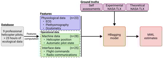 To that end, nine professional helicopter pilots conducted two realistic scenarios in a Full-Flight simulator. Pilots were equipped with several sensors to monitor their physiological parameters. Operational data from the simulator were also recorded: i.e., the interaction between the pilots and the HMI and the state of the simulated aircraft. A heuristic-based bagging algorithm (HBagging [41]) was then used and trained on a collection of heterogeneous signals to estimate the MWL of professional helicopter pilots. The model can automatically select the optimal subset of metrics that leads to the best predictive power while discarding the others. Such an approach allowed us to address the challenge of ecological MWL prediction in an unbiased manner and to gain valuable knowledge about the most relevant sources of information for this task.