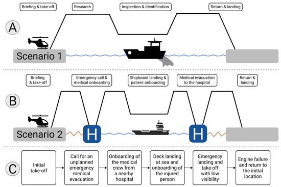 Flight scenarios. (A,B) Illustration of the different phases of the two scenarios. (C) breakdown of the second scenario’s unexpected events.