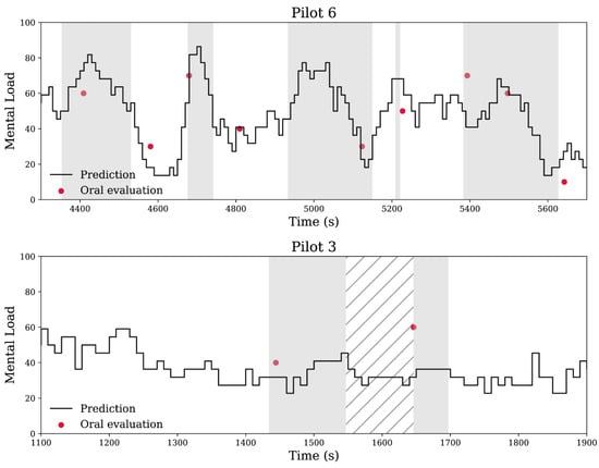 MWL estimation in two examples. Excerpts of the continuous mental workload prediction for the sixth pilot (above) and the third one (below) in the second scenario. The red dots correspond to the self-assessments of the mental workload (the ground truth). Portions of the scenarios highlighted in gray represent flight phases where the mental workload should objectively be high (landings, take-offs, cognitive tasks, etc.). The hatched region corresponds to a social task (radio communication).