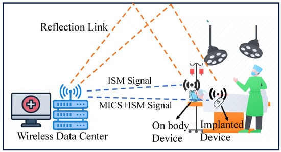In recent years, wireless technologies have seen growing application in biomedical treatments, including remote monitoring, implantable medical device (IMD) communication, and intelligent health management [,,]. Among these, body-centric wireless communication systems (BWCSs) have gained significant attention due to their ability to acquire and store patient physiological data in real time. A typical BWCS consists of an external data processing center (DPC) and multiple IMDs. To extend the operational lifespan of IMDs, these devices generally operate in two modes: sleep mode and wake-up mode. During wake-up mode, IMDs communicate with the DPC via the Medical Implant Communication Service (MICS) band (402–405 MHz), whereas in sleep mode, they operate in the Industrial, Scientific and Medical (ISM) GHz band (2.4–2.48 GHz) solely to receive wake-up signals, thereby minimizing power consumption [,]. Consequently, both the antennas in IMDs and DPC need to support dual-band operation in the MICS and ISM bands to ensure system stability and efficiency. In addition, a dual-band DPC antenna can utilize the MICS and ISM bands separately to establish communication with implantable and on-body devices, enhancing system flexibility and robustness.