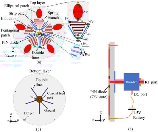 Schematic diagram of the proposed dual-band MLPR antenna. (a) Top layer of the antenna. (b) Bottom layer of the antenna. (c) Schematic diagram of DC bias circuit.