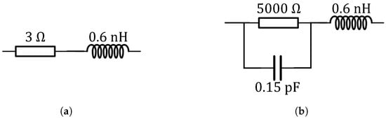 The PIN diode used in this design is the Infineon Bar50-02V, which operates within a frequency range of 10 MHz to 6 GHz. According to its datasheet in [], the equivalent circuit model of the adopted PIN diodes are illustrated in Figure 3. In the ON state, it can be approximated as a resistor in series with a nH inductor, whereas in the OFF state, it can be modeled as a resistor in parallel with a capacitor with a capacitance value of , both in series with a nH inductor. The capacitance varies with frequency—approximately pF in the MICS band and pF in the ISM band. The two isolation inductors used are manufactured by Fenghua Advanced Technology. Inductor 1 (model VHF160808HR18JT) exhibits high impedance to RF currents around 400 MHz while maintaining DC continuity. Inductor 2 (model VHF160808H15NJH) provides high impedance around GHz while acting as a 15 nH inductor for MICS band RF currents and DC signals. Detailed data for the above high-frequency inductors can be obtained from []. A V battery supplies the necessary conduction current through a Bias-tee and DC pins.