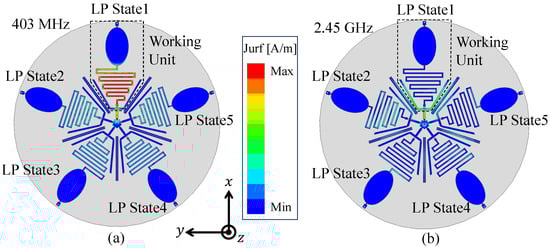 Current distribution of the antenna at different frequencies under LP. (a) 403 MHz, (b) 2.45 GHz.