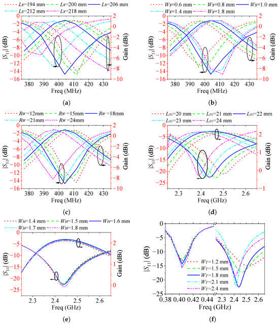 The effect of different main parameters on the performance of the antenna in LP. (a) , (b) , (c) , (d) , (e) , (f) .