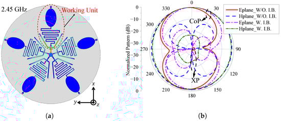 Due to the compact layout of the proposed dual-band MLPR antenna, the active radiating branches are susceptible to interference from adjacent inactive branches. During the simulation-based design process, it was observed that in the absence of isolating branches, strong electromagnetic coupling occurs between active and neighboring inactive units, particularly in the ISM band. As illustrated in Figure 6a, such coupling leads to elevated cross-polarization levels (XPLs) in certain directions, thereby degrading the overall radiation purity, as shown in Figure 6b. To address this issue and achieve low XPL across all directions, we introduce isolating branches between adjacent radiating elements. Inspired by the approach in [], these isolating branches adopt a dual-line structure that forms additional coupling paths. The induced currents in these paths are designed to be out-of-phase with the original near-field coupling currents, leading to effective cancellation and suppression of mutual coupling effects. Figure 6b also presents the radiation pattern of the antenna at GHz with the isolating branches included. It is evident that, compared to the configuration without isolation structures, the XPL is significantly reduced, demonstrating the effectiveness of the proposed decoupling strategy.