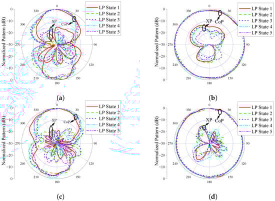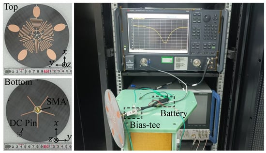 To achieve polarization reconfigurability, PIN diodes are soldered between the pentagonal feed patch and each feedline. By selectively switching the PIN diodes, different radiating units can be activated, enabling polarization switching. In this work, to supply the required DC bias for the PIN diodes, we adopted a Bias-tee and a V battery at the antenna feed end, as illustrated in Figure 2c. It should be pointed out that the Bias-tee and the battery are external devices that provide DC bias for the antenna. This approach is widely used and effective for the design and verification of reconfigurable antennas. For the proposed antenna, the negative terminal of the battery is connected to the DC port of the Bias-tee, and then connected to the negative terminals of all PIN diodes through the inner conductor of the coaxial probe and the pentagonal feed patch. The positive terminal of the battery is connected to a DC pin, which can be connected to the anode of the corresponding PIN diode through the corresponding DC pad and the metal patch printed on the top layer of the substrate, so that the diode is in the ON state.