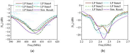 The simulated and measured curves are presented in Figure 8. Due to the rotational symmetry of the proposed antenna, this paper only presents the simulation results of the antenna in one polarization state for comparison. The measured values under five different polarization states exhibit good consistency. Although there are some differences between the measured and the simulated one due to manufacturing and welding errors, the measured results confirm that the antenna’s overlapping operating bands cover 401–409 MHz and 2.34–2.53 GHz, effectively encompassing the MICS and ISM GHz frequency bands.