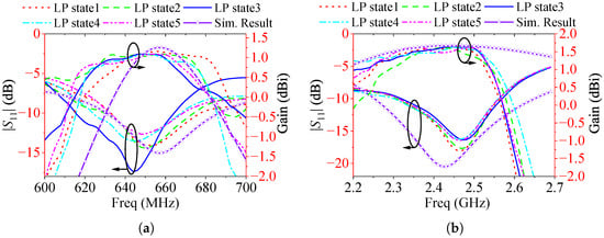 Measured and gain curves of the fabricated antenna Prototype 2 under two different frequency bands, (a) 600–700 MHz; (b) 2.20–2.70 GHz.