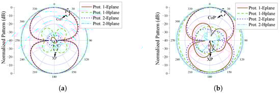 Comparison of simulated patterns of Prototype 1 and Prototype 2. (a) Prototype 1 at 403 MHz and Prototype 2 at 650 MHz; (b) Both prototypes are at GHz.