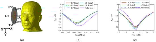 Figure 13b,c show the simulated curves of the antenna in the MICS and ISM bands, respectively. The of the antenna in free space (Reference) are also given in the figure for comparison. It can be observed that the antenna maintains dB in both frequency bands, even in the presence of the human head, indicating robust impedance matching. In the MICS band, a slight downward shift in resonance frequency (1–2 MHz) is noted, accompanied by a marginal degradation in return loss. This is attributed to the high dielectric constant and conductive nature of biological tissues, which influence the near-field reactive impedance of the low-frequency monopole structure. In the ISM GHz band, the impact is slightly smaller, with the resonance frequency shifting down by approximately 5 MHz and a small increase in values for certain frequency points. Nonetheless, the antenna still operates effectively across the full ISM GHz band. These results demonstrate that the proposed MLPR antenna exhibits stable impedance performance in realistic body-centric scenarios.