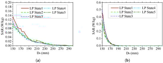 In Figure 14, we show the SAR of the human head obtained by simulation with an input power of 1 W. The variable represents the distance from the center of the antenna surface to the observation point. Since the distance between the antenna surface and the human head surface is set to 150 mm, the range of is given as 150–300 mm. Figure 14a,b show the SAR curves at 403 MHz and GHz, respectively. It can be seen that the SAR value gradually decreases with increase in distance. In both frequency bands, the maximum SAR value does not exceed W/kg. In this simulation case, the SAR of the antenna meets the general safety requirements (less than W/kg).
