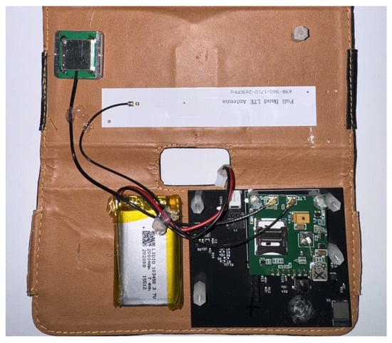 The core of this study, namely, the wearable main module, is shown in Figure 2. As mentioned above, the main module consists of three functional components, i.e., a microcontroller, a six-axis inertial sensor, and an NB-IoT module. Physically, the main module is primarily made up of two stacked printed circuit boards (PCBs), the lower black system board and the upper green SIM7000G module. The microcontroller, responsible for computation, and the six-axis inertial sensor, responsible for posture detection, are placed on the system board. Additionally, the system board also includes a power management chip, which regulates the voltage of the lithium-ion battery and provides power to the module. The PCB layout of the system board is shown in Figure 3. In addition, the green printed circuit board (PCB) stacked above the black system board is the SIM7000G module. Since the SIM7000G module integrates both GPS positioning and NB-IoT communication functions, a GPS receiver and a mobile communication antenna are also required. The smaller green square module in Figure 2 is the GPS receiver, while the white elongated object on the left is the full-band ution (LTE) antenna. We integrated a system board containing the MCU and IMU, the SIM7000G module, a 2000 mAh lithium-ion battery, the GPS receiver, and the LTE antenna into a wearable pouch case, similar to an eyeglass case, as shown in Figure 4. Once the integration was completed, the pouch case could be worn by elderly individuals for fall detection. Below, we will introduce the specifications of the main components of this module.