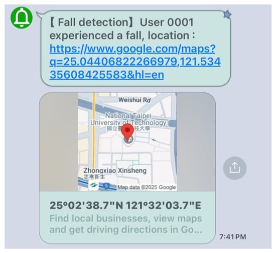 LINE is an instant messaging application developed and launched in Japan by LINE Corporation, a subsidiary of South Korea’s Naver Corporation. Since its launch in 2011, it has become a highly popular messaging APP in Asia, especially in countries like Japan, Taiwan, Thailand, and Indonesia. In addition to offering basic messaging and calling features, LINE provides a wide range of services, making it a versatile social platform. In this study, we integrated the LINE API to incorporate the message push service into the LINE platform, leveraging this feature to send GPS location information and fall alert notifications. An illustration of the LINE notification message triggered when an elderly person experiences a fall is shown in Figure 5.