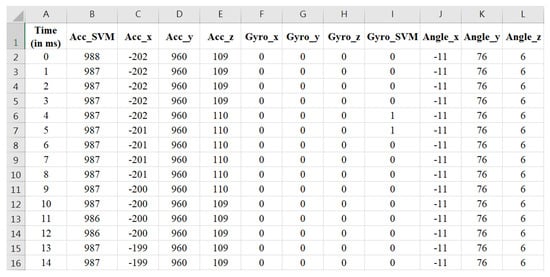 During the algorithm development phase, the STM32WB5MMG MCU transmitted the collected IMU data via BLE to a laptop running an offline application for analysis. In this study, the Offline Analysis APP was developed using a C# WinForm application, which received accelerometer and gyroscope data from the main module. To facilitate algorithm analysis, the APP’s interface also displayed waveform variations for the accelerometer and gyroscope sensors along each individual axis, as shown in Figure 6 and Figure 7. Additionally, the IMU data collected by the Offline Analysis APP was simultaneously saved in CSV format, as illustrated in Figure 8.