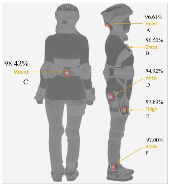 To investigate the impact of sensor wearing methods and placement on fall detection performance, a detailed analysis and comparison were presented in [25]. The study tested sensor placements on the right wrist, right thigh, right ankle, chest, waist, and head. A total of 14 participants were invited to take part in the experiments, where they performed 20 simulated falls and 16 activities of daily living. The performance results of sensor placement at different positions are shown in Figure 9. It was found that placing the sensor on the waist, which achieved an accuracy of up to 98.42%, was the most ideal location. Based on the analysis results in [25], the proposed fall detection module was placed on the user’s waist in this study, as shown in Figure 10.