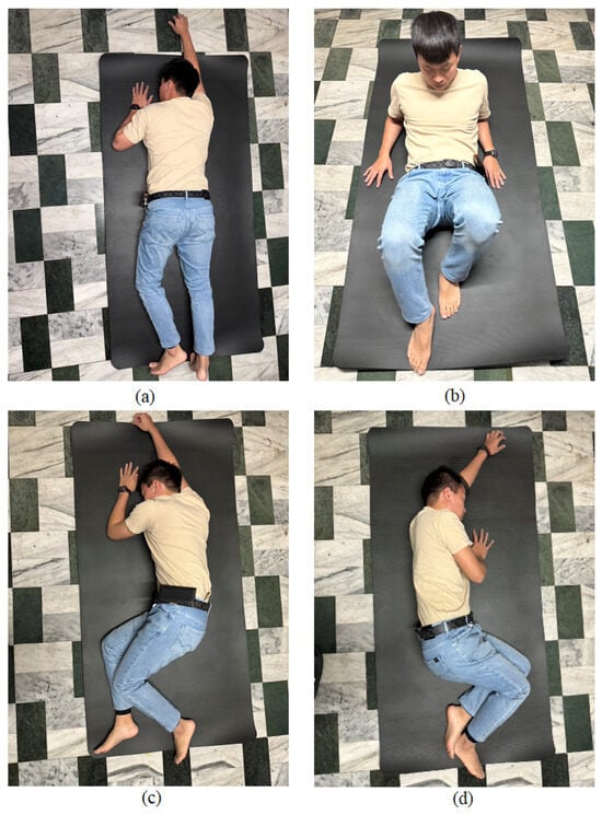 Scenario of four types of falls. (a) Forward fall (b) Backward fall (c) Right-side fall (d) Left-side fall.