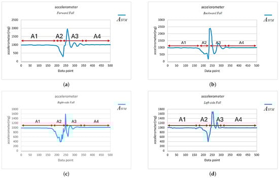 SVM signals of the accelerometer for four different fall directions. (a) Forward fall. (b) Backward fall. (c) Right-side fall. (d) Left-side fall.