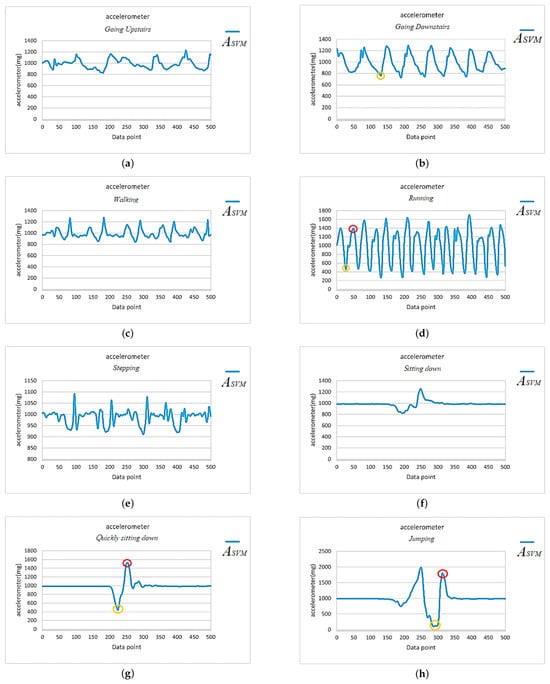 SVM signals of the accelerometer for eight different daily activities. The orange circles indicate instances where is below 0.8 G and the red circles indicate when it exceeds 1.4 G. (a) Going upstairs. (b) Going downstairs. (c) Walking. (d) Running. (e) Stepping. (f) Sitting down. (g) Quickly sitting down. (h) Jumping.