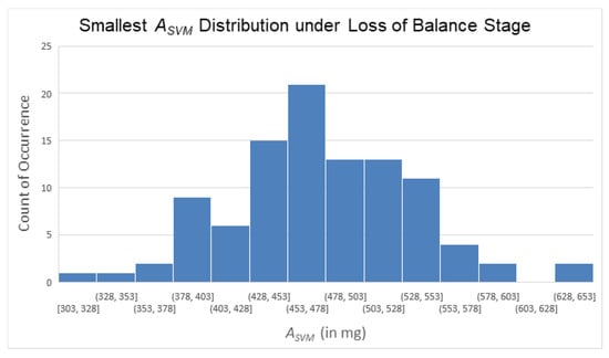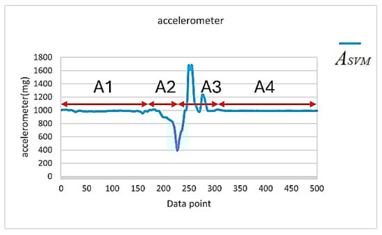 By observing the waveform in Figure 14, we can see that the total number of data points in the A2 and A3 stages did not exceed 200 points (i.e., 2 s). Therefore, a value of less than 0.8 G was used as the trigger point in this study. In other words, once dropped below 0.8 G, the microcontroller began recording 200 data points and checked if any of the recorded points had an value exceeding 1.4 G. If an value greater than 1.4 G was detected, this meant that a fall event may have occurred, but a further assessment was required.