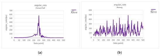 The signal vector magnitude of the gyroscope. (a) The signal vector magnitude of the gyroscope during a forward fall. (b) The signal vector magnitude of the gyroscope during running activity.