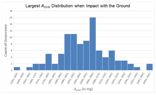 - Impact with the ground (Stage A3): The fall process was followed by a rapid increase in the signal vector magnitude due to the impact with the ground, which then quickly dropped until the subject’s movement in the vertical direction to the ground stopped. Based on experimental statistical analysis, at the moment of impact with the ground, the signal vector magnitude exceeded 1.4 G, indicating that the subject experienced a large force in the direction opposite to their motion at the moment of impact.