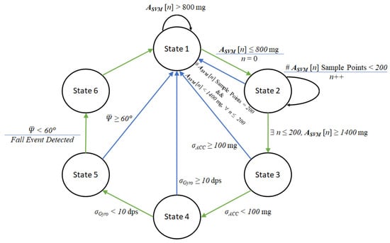 - The FSM employs a staged decision-making process, similar to a cascade classifier. If any stage fails to meet the defined criteria, the possibility of a fall is immediately excluded, thus avoiding subsequent evaluations and reducing computational load and power consumption.