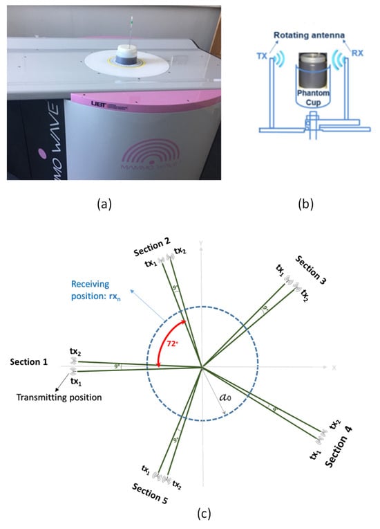 The MammoWave device (Figure 1) is constituted by an aluminum cylindrical hub. The device’s internal surfaces are shielded with absorbing material. The instrument (appropriately integrated with a bed) is additionally constituted by a hub with a cup that is placed to contain the breast of the patient (prone position) or, in this case, the phantoms, and two arms to associate the transmitter (tx) and the receiver (rx) to the hub through rotation.