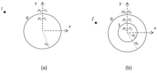Let us consider now a 2-layer stratified dielectric cylinder with external radius illuminated by the line source radiating in free space (Figure 2b) [18]. The cylinder is positioned at the center of the reference system. The external layer is characterized by relative constants , and by conductivity . It holds () that