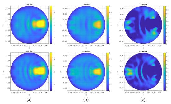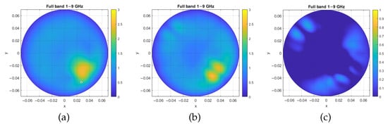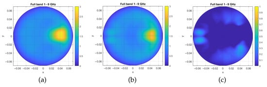 Figure 3b refers to the image generated when using the simulated in Equations (1) and (2), obtained following the analytical simulation approach given in the previous section. Finally, in Figure 3c, a map of the relative error is given. In Figure 3, the full frequency band of 1–9 GHz is investigated.