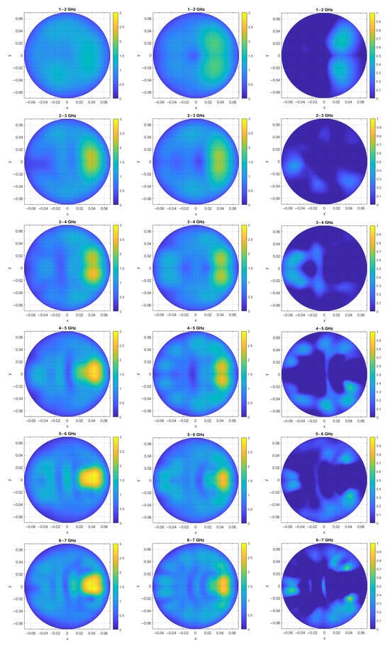 Subsequently, we performed an additional investigation to observe the effect of individual 1 GHz sub-bands on the relative error. Figure 5a, from top to bottom, depicts the images obtained through measurement for individual sub-bands starting from 1–2 GHz and ending at 8–9 GHz, respectively. Similarly, the rows of Figure 5b display images generated through the analytical simulation approach for the same sub-bands. Finally, Figure 5c shows the relative error map corresponding to the eight individual sub-bands. It should be noted that, for each sub-band, the corresponding dielectric properties specific to that frequency range were used [22].