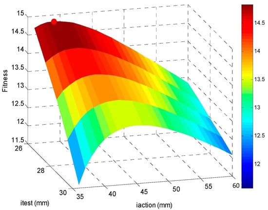 The PSO algorithm demonstrates efficient navigation of the design space, maintaining an equilibrium between global search breadth and local refinement precision. Through the weighted multi-objective function, a Pareto-optimal configuration is identified, achieving maximal signal-to-noise ratio while preserving strain sensitivity. The results show that the optimized positions itest = 26 mm and iaction = 39 mm achieve a strain signal amplitude of 14.7 με with an SNR of 14.8 dB. The three-dimensional objective function landscape (shown in Figure 2), plotted as a function of sensor (itest) and actuation (iaction) positions, further confirms that the fitness achieves peak (marked by the red dot in Figure 2) when positioned 39 mm from the clamped boundary. This configuration simultaneously maximizes strain magnitude and SNR.