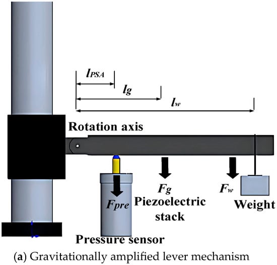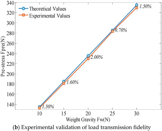 Equation (14) is formulated under the rigid-body assumption, where the lever undergoes negligible bending deformation. To validate this assumption, the lever’s geometric and material properties including its square cross-section (16 × 16 mm2), Steel 45 composition, and axial stiffness (1.5 × 108 N/m) were designed to minimize flexural strain. Experimental parameters were configured as follows: Lever arm lengths: lPSA = 35 mm, lw = 350 mm, lg = 175 mm; Gravitational forces: Lever self-weight Fg = 7 N; applied weights Fw= 10, 15, 20, 25, 30 N. Theoretical prestress values, calculated via Equation (14), were compared against experimental measurements obtained from a high-stiffness pressure sensor (1 × 107 N/m). As summarized in Figure 3b, the close agreement between theoretical and experimental results (deviation < 2%) confirms the validity of the rigid-body assumption and demonstrates precise prestress control through weight adjustment, with bending strains remaining below detectable thresholds (<1 με).