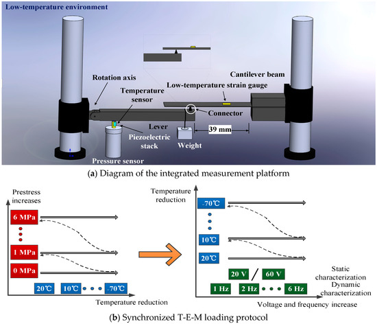 To quantify the interdependent effects of low-temperatures (down to −70 °C), compressive prestress (0 to 6 MPa), and electrical excitation (0 to 120 V) on the PSA’s load-bearing capacity, a custom instrumentation system was engineered with two core capabilities: 1. Temperature-invariant prestress application: A lever-based loading mechanism (Figure 3a) generates stable mechanical preloads via gravitational force amplification, immune to thermal variations. 2. Low-temperature performance evaluation: Characterization of the PSA’s load-bearing capacity could be conducted at sub-zero temperatures.