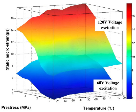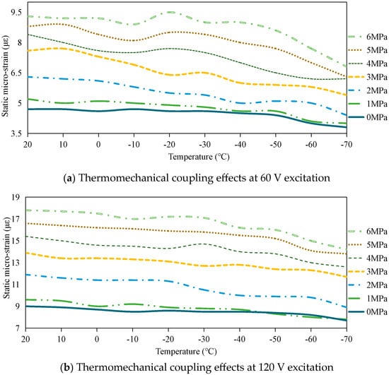 Quantitative analysis indicates a 15–30% reduction in static micro-strain when temperature decreases from 20 °C to −70 °C. Conversely, increasing prestress from 0 MPa to 6 MPa produces 79–90% micro-strain enhancement. These proportional relationships between electromechanical parameters (excitation voltage, temperature, prestress) and mechanical response validate the deterministic nature of the stack’s load-bearing capacity under specified operational conditions.