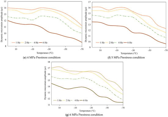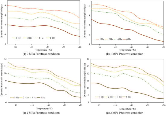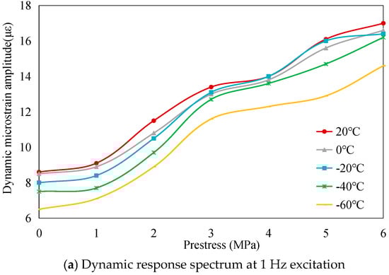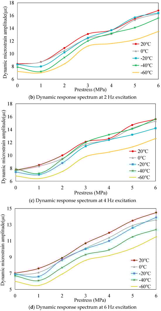 The dynamic load-bearing capacity of the PSA was systematically investigated through cyclic voltage excitation tests. Sinusoidal AC signals (120 V amplitude, 1–6 Hz frequency range) were applied to quantify temperature- and prestress-dependent variations in load-bearing capacity, with dynamic responses characterized by micro-strain peak-to-peak magnitudes. Experimental data reveal three principal trends: First, frequency-dependent attenuation occurs across the tested spectrum, as depicted in Figure 8. This behavior stems from dual constraints-peak current limitations in power amplification systems and finite response velocities inherent to piezoelectric materials. Second, parametric investigations demonstrate prestress-enhanced capacity under isothermal conditions and thermal-diminished performance under fixed mechanical preloads (Figure 9), mirroring static load-bearing trends established in prior analyses. These congruent patterns across static and dynamic regimes confirm the robustness of prestress- and temperature-dependent relationships in governing stack performance.