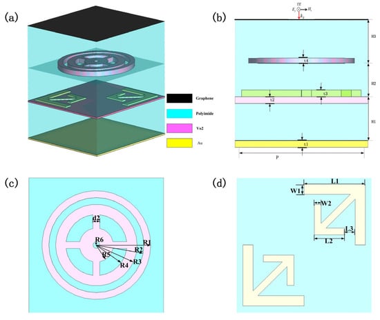 At the same time, VO2 is a material that is distinctive for its remarkable phase transition characteristics []. As a metal oxide, it undergoes a reversible transformation from a metal to an insulator at around 68 °C. This transition results in substantial alterations in key properties such as electrical conductivity, light absorption, dielectric constant, and lattice structure, offering great potential for diverse technological applications. This paper presents an innovative dual-function design that seamlessly integrates a broadband absorber and a broadband dual-band polarization converter. The proposed structure leverages a reconfigurable metasurface, which exploits the insulator-to-metal phase transition of vanadium dioxide to achieve tunable electromagnetic responses [,]. Therefore, integrating the properties of VO2 and graphene in a single design offers an effective approach to achieve multi-functional, switchable, and reconfigurable absorbers []. In an exceptional research endeavor, scientists developed a tunable dual-band terahertz (THz) absorber by combining VO2 and graphene. By taking advantage of the adjustable characteristics of graphene and the phase transition traits of VO2, this device facilitated the transition between low-frequency and high-frequency broadband absorption []. Further advancements led to the creation of active, switchable, multi-functional metamaterials. For instance, a system combining VO2 and graphene demonstrated remarkable performance; upon VO2’s shift to its metallic state, the metamaterial functioned as a multi-band ideal absorber. It demonstrated polarization independence and high resilience to variations in incident angles []. Behnaz Bakhtiari and her colleagues put forward a dual-function broadband adjustable terahertz polarization converter metasurface. The constructed structure has a combined setup of electromagnetic materials, allowing for adjustable polarization conversion in both the reflection and transmission modes []. These works underscore a broader trend in metamaterials research: the pursuit of tunable, multi-functional designs that can switch between different states and broaden their operational bandwidths [,,,,]. While significant progress has been made, achieving a wider operational range during function switching remains a substantial challenge.