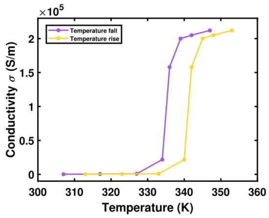 The conductivity changes of VO2 in relation to temperature during the heating and cooling processes were sourced from references []. These data are then presented in Figure 2. Evidently, temperature fluctuations have a substantial impact on the conductivity of VO2, particularly at the phase transition point. Owing to the thermal hysteresis phenomenon, there are minor disparities between the transition curves of the heating and cooling cycles. Nevertheless, this does not influence the shift between the two stable phases. Using the graph in Figure 2 and Equation (1), one can calculate the relative permittivity of VO2 at various temperatures.