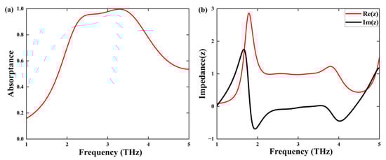 The absorption spectrum obtained from this work is presented in Figure 3a. The broadband absorption spectrum vividly shows that the absorber attains outstanding absorption efficiency for electromagnetic waves within the frequency span of 2.28–3.73 THz. It has a bandwidth of roughly 1.45 THz, and the absorption ratios exceed 90%. Significantly, within the frequency range from 3.00 to 3.47 THz, the absorber reaches an impressive 98% absorption rate. Moreover, this research paper presents the notion of relative impedance to evaluate the outcomes. The formula for relative impedance is as follows [,]: