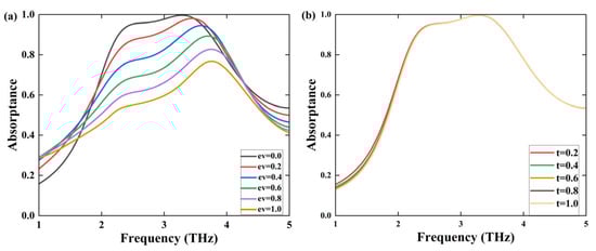 As shown in Figure 4a, it can be clearly seen that the absorber consistently attains an energy absorption ratio surpassing 90% in the frequency interval from 2.28 to 3.73 THz. However, a variation in the chemical composition of graphene correlates with a gradual decline in absorption efficiency. This alteration can significantly impact the electronic structure of graphene, specifically affecting key parameters such as carrier concentration and mobility. A reduced carrier concentration can lead to the enhanced reflection of electromagnetic waves, diminishing their absorption. Furthermore, alterations to the chemical makeup can also have an impact on the surface unevenness of graphene. This surface unevenness is of great importance as it is closely linked to the reflection and dispersion of electromagnetic waves. Increased surface roughness can result in greater scattering, thus enhancing reflection. This interplay between chemical composition and surface characteristics is crucial for optimizing the absorber’s performance [].