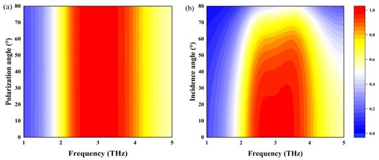 In the preceding discussion, we examined the characteristics of the absorber under normal incidence. However, it would be advantageous to design an absorber that can operate effectively under oblique incidence, thus emphasizing the significance of investigating its angular performance. Figure 5a shows that when the polarization angle ranges from 0° to 80°, there is a change in the absorption rate. This implies that polarization has a minimal influence on the overall functionality of the absorber. This polarization insensitivity arises from the intrinsic symmetry of the absorber. As the incident angle increases, the operating bandwidth and intensity of the incident wave remain remarkably stable up to 50°, where absorption efficiency still reaches 90%, as depicted in Figure 5b. However, when the incident angle exceeds 50°, the performance begins to deteriorate due to the reduction in the strength of the magnetic field’s parallel component.