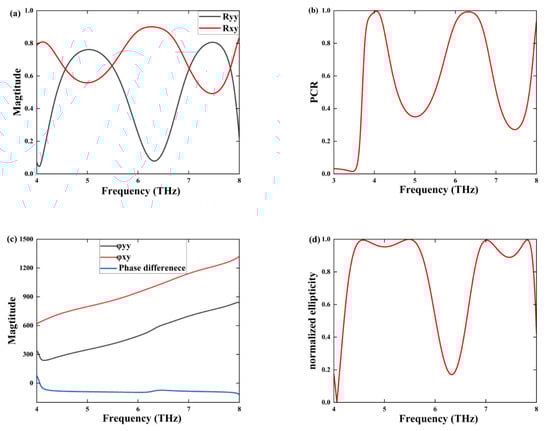 (a) Reflection coefficients of the metamaterial; (b) PCR; (c) ϕxy ϕyy and phase difference; (d) the normalized ellipticity.