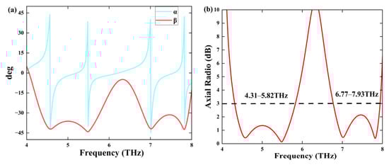 Figure 7b illustrates that within the frequency ranges of 4.31–5.82 THz and 6.77–7.93 THz, AR is less than 3 dB. All polarization ellipses with AR values below 3 dB can be approximated as circular.
