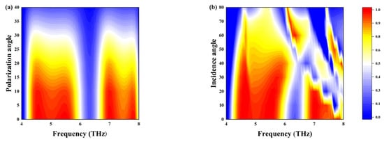 Figure 8a illustrates that the polarization angle significantly affects the transition from linear-to-circular polarization. As the polarization angle increases, the normalized ellipticity decreases. In particular, when the polarization angle is 0°, the normalized ellipticity is nearly 0. Figure 8b depicts the effect of the angle of incidence (varying from 0° to 80°) on the normalized ellipticity. It is evident that within the frequency span of 4.31 to 5.82 THz, the device shows virtually no responsiveness to the angle of incidence. However, between 6.77 and 7.93 THz, the angle of incidence substantially affects the normalized ellipticity. This indicates that the angle of incidence has minimal impact on the first frequency band, but a more significant impact on the second frequency band.