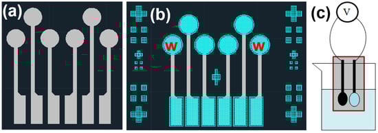 Layout diagrams of (a) the electrode platform’s conductive layer (gray) and (b) the electrode platform’s second layer (blue), and (c) a schematic diagram of the open-circuit voltage measurement.