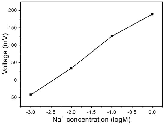 During NaCl solution sensing experiments, these pores may trap a significant amount of ions from the previous test solution, making it difficult for the new test solution to replace the old one. This would limit the ion-selective electrode’s sensitivity to NaCl. Therefore, the concentrated thin-film solution was applied in the final step to serve as the sensing layer between the working electrode and the solution. After this step, the working electrode used in this experiment was complete. Next, the open-circuit voltage was measured using a Keithley 2450 (Keithley Instruments, Cleveland, OH, USA). The related analyses included the voltage response to the concentrations of different ions (Na+, K+, and Ca2+), response time, and the device’s selectivity to other ions. For different ion concentrations, standard solutions purchased and deionized water were used for preparation. For testing at different pH levels, ammonia and nitric acid were mixed with deionized water to avoid the unknown concentration of Na+ ions that might be present in purchased pH buffer solutions. In observing the measurement limits, conditions where the voltage fluctuation did not exceed 10 mV were considered valid data. Figure 1c shows a schematic of the open-circuit voltage measurement. The working electrode and reference electrode were placed in the same solution, and the instrument was used to measure the potential difference between the two electrodes, which indirectly indicated the Na+ ion concentration. The Na+ ion sensor consisted of a working electrode and a reference electrode (indicated by the red “w” in Figure 1b). The working electrode was formed by applying a solution we prepared onto the carbon electrode.