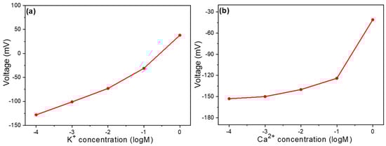 Voltage vs. concentration curve of a Na+ ion sensor for (a) K+ ions and (b) Ca2+ ions.