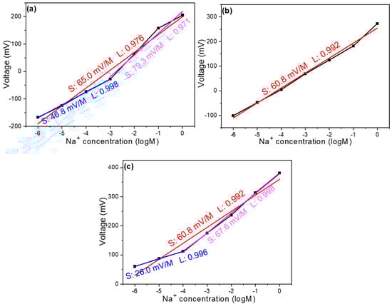 Concentration response curve of a Na+ ion sensor (a) without the addition of GO, with the addition of (b) 4 mg GO and (c) 8 mg GO.