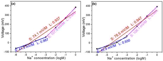 Concentration response curve of a Na+ ion sensor with the addition of (a) 4 mg MWCNTs and (b) 8 mg MWCNTs.