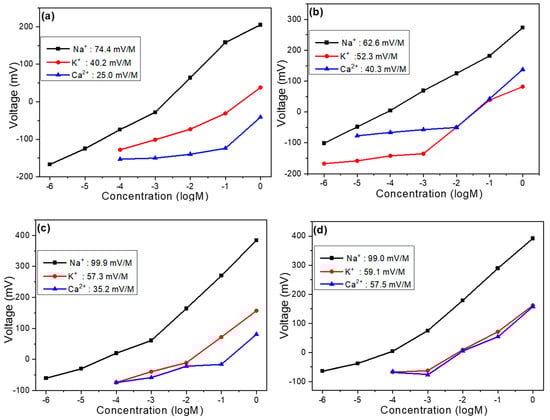 (a) Undoped device, (b) device with 4 mg GO addition, (c) device with 4 mg MWCNT addition, and (d) device with 8 mg MWCNT addition: voltage versus concentration relationships for Na+, K+, and Ca2+ ions (selectivity analysis).
